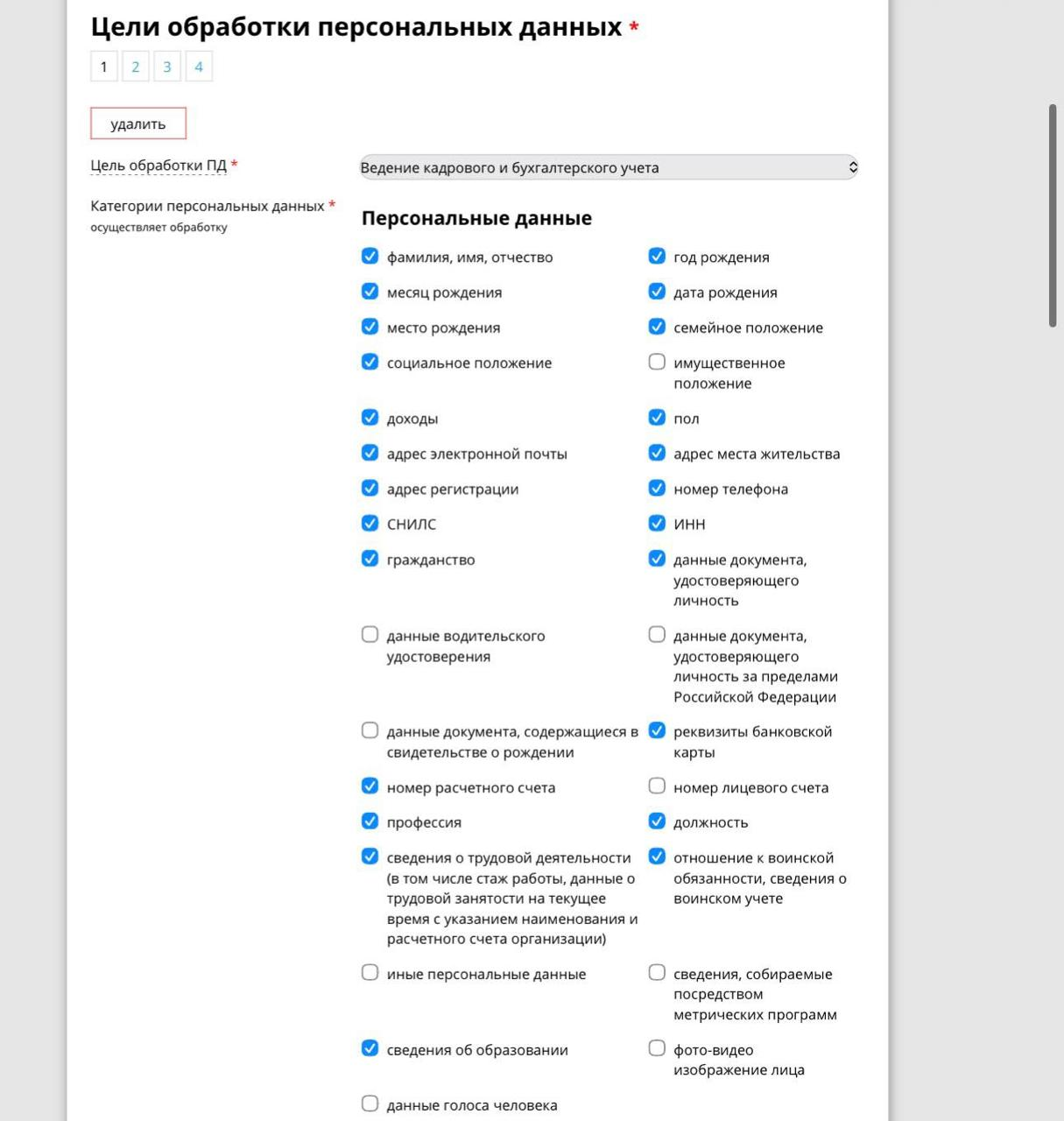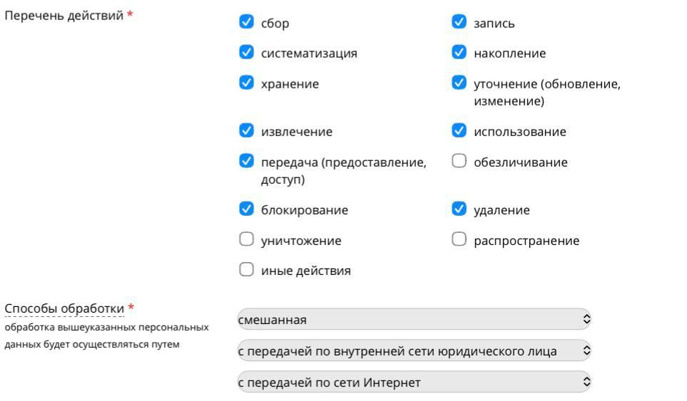 Здесь необходимо указать все цели обработки персональных данных, а также способы, которые используются для их обработки. Важно, чтобы для каждой цели была определена категория обрабатываемых данных. Например, для целей ведения кадрового учета или заключения договоров.